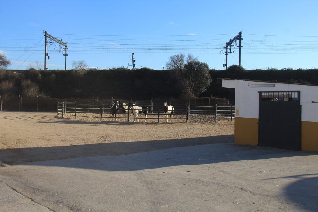 Pista redonda para el manejo de los potros, pista reglamentaria de doma y noria para el trabajo de los caballos.